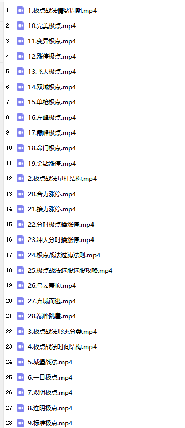 1.极点战法情绪周期.mp4 2.极点战法量柱结构.mp4 3.极点战法形态分类.mp4 4.极点战法时间结构.mp4 5.城堡战法.mp4 6.一日极点.mp4 7.双阴极点.mp4 8.连阴极点.mp4 9.标准极点.mp4 10.完美极点.mp4 11.变异极点.mp4 12.涨停极点.mp4 13.飞天极点.mp4 14.双域极点.mp4 15.单枪极点.mp4 16.左峰极点.mp4 17.巅峰极点.mp4 18.命门极点.mp4 19.金钻涨停.mp4 20.合力涨停.mp4 21.接力涨停.mp4 22.分时极点擒涨停.mp4 23.冲天分时擒涨停.mp4 24.极点战法过滤法则.mp4 25.极点战法选股选股攻略.mp4 26.乌云盖顶.mp4 27.弃城而逃.mp4 28.巅峰跳崖.mp4